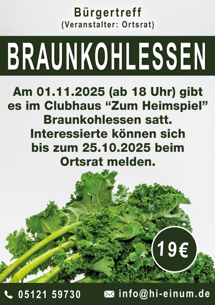 im Rahmen des monatlich stattfindenden Bürgertreffs lädt Sie der Einumer Ortsrat alle ganz herzlich zum diesjährigen gemeinsamen Braunkohlessen im Clubhaus des SV Einum ein. Lassen Sie uns gemeinsam einen schönen Abend bei gutem Essen und netten Gesprächen verbringen.