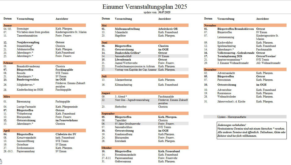 Liebe Gäste, auf dieser Seite finden Sie unseren jährlichen Terminkalender mit Veranstaltungen des Ortsrates sowie der Vereine und Verbände